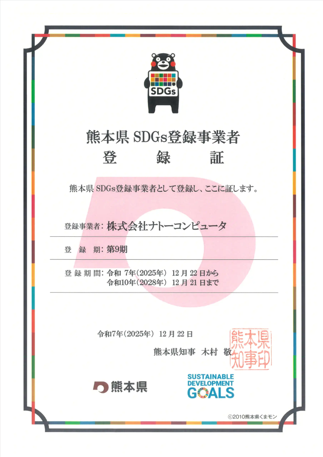 株式会社ナトーコンピュータは、熊本県の「熊本県SDGs登録事業者」として認定されましたので、お知らせします。